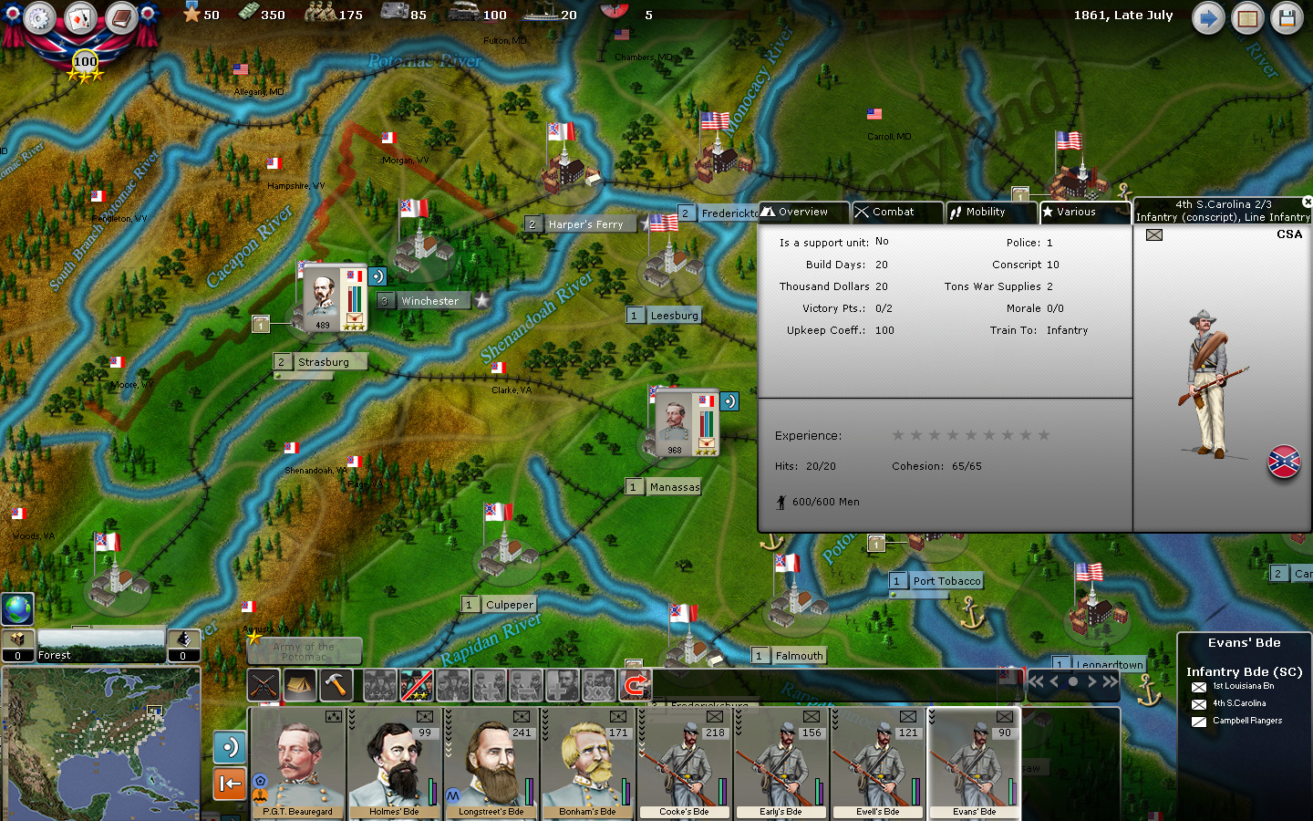| One of the accomplishments of AGEOD's Civil War games is the portrayal of command and how it influenced the outcome of the war. In this screen, I'm navigating through the unit's stats. But actually what I need is more and better generals. Right click and open on a new tab or window for a high resolution view. |
