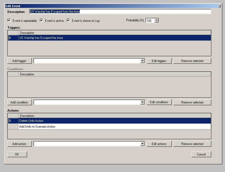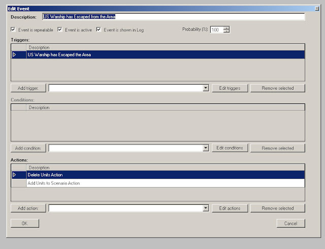 | The US Warship has Escaped from the Area event: one trigger, no conditions, two actions. |