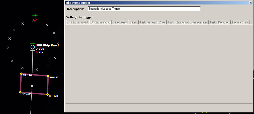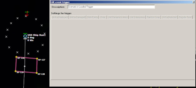 In the screenshot above you will notice that in order to check a unit entering an area, the scenario author has to define such area. In this case it is a rectangle delimited by reference points (RP126 through RP129, magenta rectangle in the map). This "escape area" is entirely arbitrary from my part. I wanted to stop the simulation run when the US warship was out of the submarine patrol area (the area within the circle delimited by non-highlighted reference points (they look like an x).